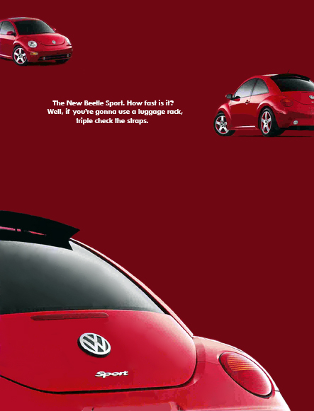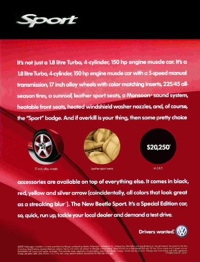 No es sólo un 1.8 litros Turbo, 4 cilindros, 150 hp "muscle car". Es un turbo de 1.8 litros, 4 cilindros, 150 hp "muscle car" con una transmisión manual de 5 velocidades, aros de aleación de 17 pulgadas con las inserciones que emparejan del color, neumáticos de 225/45 para todo clima, un techo solar (sunroof), asientos de cuero deportivos, sistema de sonido de Monsoon, asientos delanteros calentables, boquillas de lavado de parabrisas calentadas, y, por supuesto, el emblema "Sport". Y si le gusta lo excesivo, los accesorios de buena elección están disponibles encima de todo lo demás. Viene en negro, rojo, amarillo y gris (silver arrow). El New Beetle Sport, es un auto de edición especial, por lo que, rápido, corra, a su distribuidor local y solicite una prueba de manejo.