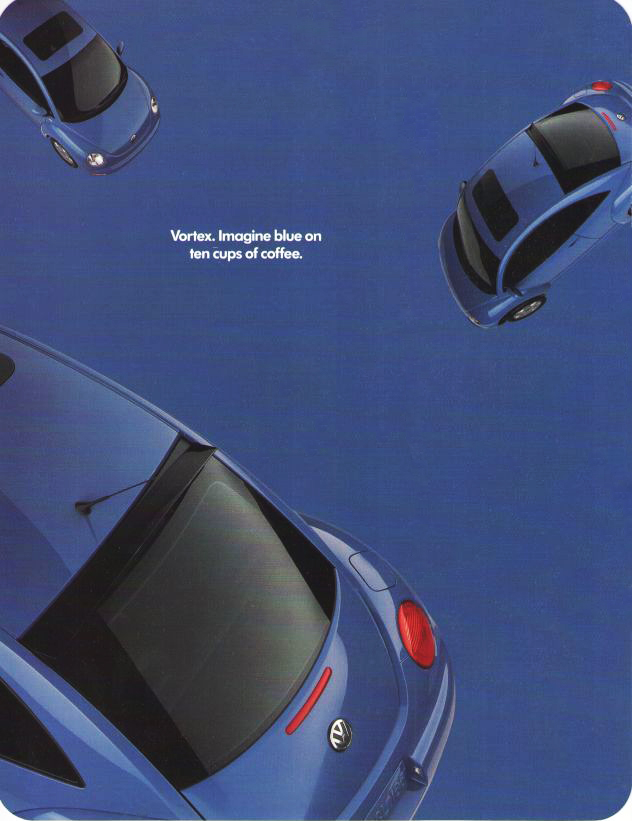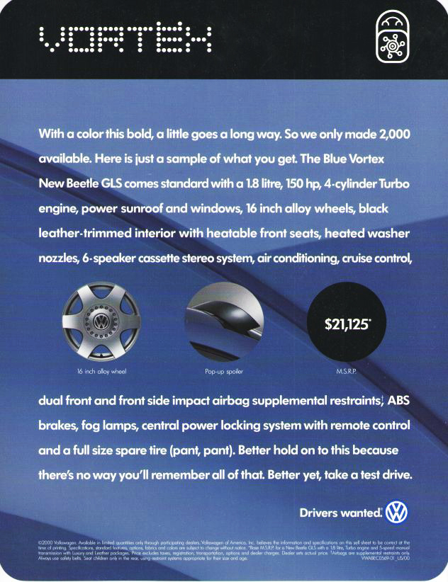 Con un color audaz, este pequeño va a un largo camino. Así que sólo hicimos 2,000 unidades disponibles. Esta es sólo una muestra de lo que obtienes. El New Beetle GLS Vortex Blue viene de serie con un motor turbo de 1.8 litros, 150 hp, 4 cilindros, techo solar y ventanas eléctricas, aros de aleación de 16 pulgadas, interior recubierto de cuero negro con asientos delanteros calentables, aire acondicionado, cruise control, frenos ABS, fog lights, sistema de cierre centralizado con mando a distancia y goma de repuesta de gran tamaño. Mejor guarda esto porque no hay forma de que recuerdes todo. Mejor aún, toma una prueba de manejo.